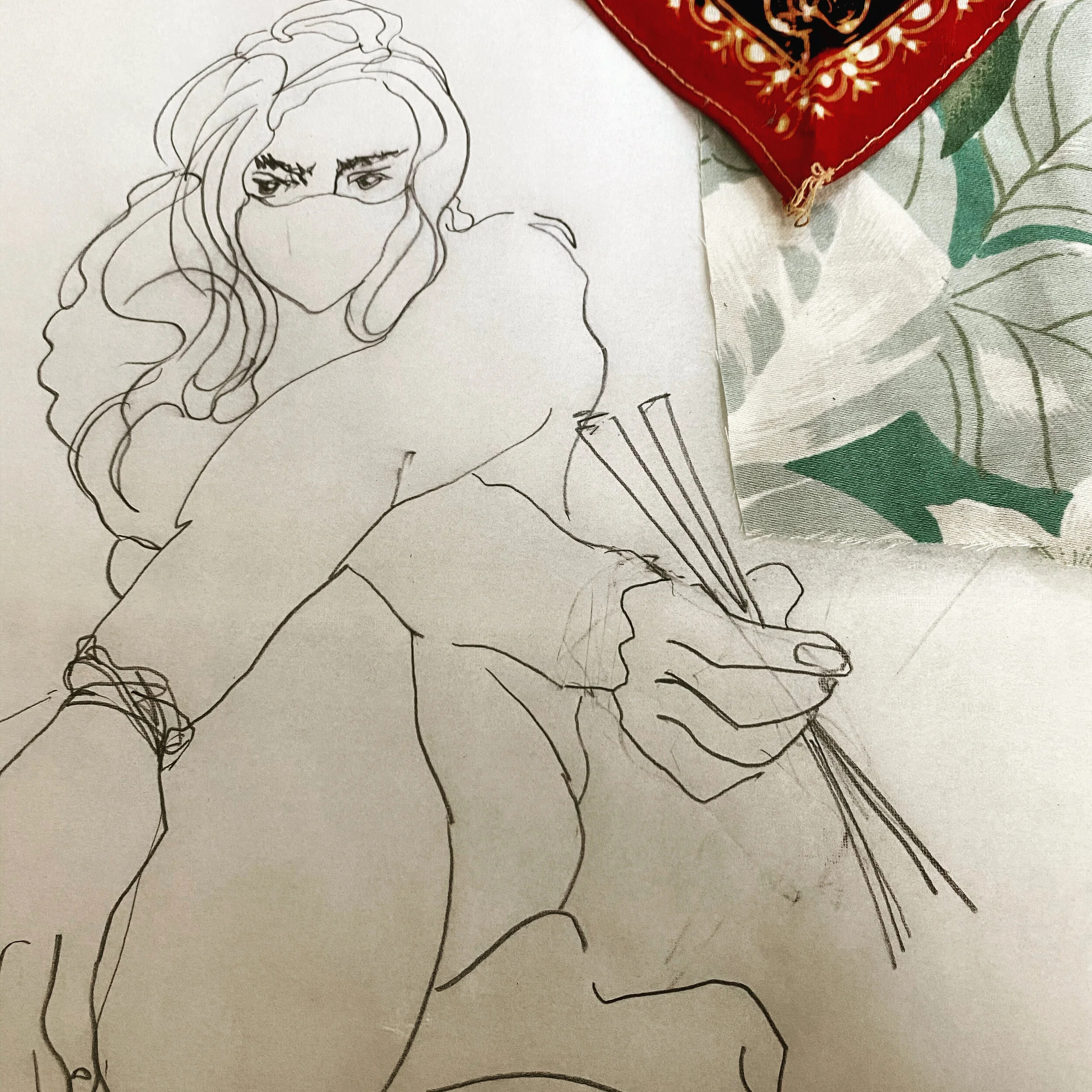 I first came up with the idea of producing thread sketches when I was designing the original “Princess and the Pea” embroidered thread drawing for an upcoming exhibition around 6 or so years ago. That piece was 2 metres high with the Princess reclining on the top of many many mattresses made from multiple fabrics of different colours. In order to work out my fabric combinations for all those stacked mattresses as well as other design elements such as the size of the figure relative to the mattresses, I decided to make a little thread sketch of the piece - like a prototype, or in sculpture we’d call it a maquette