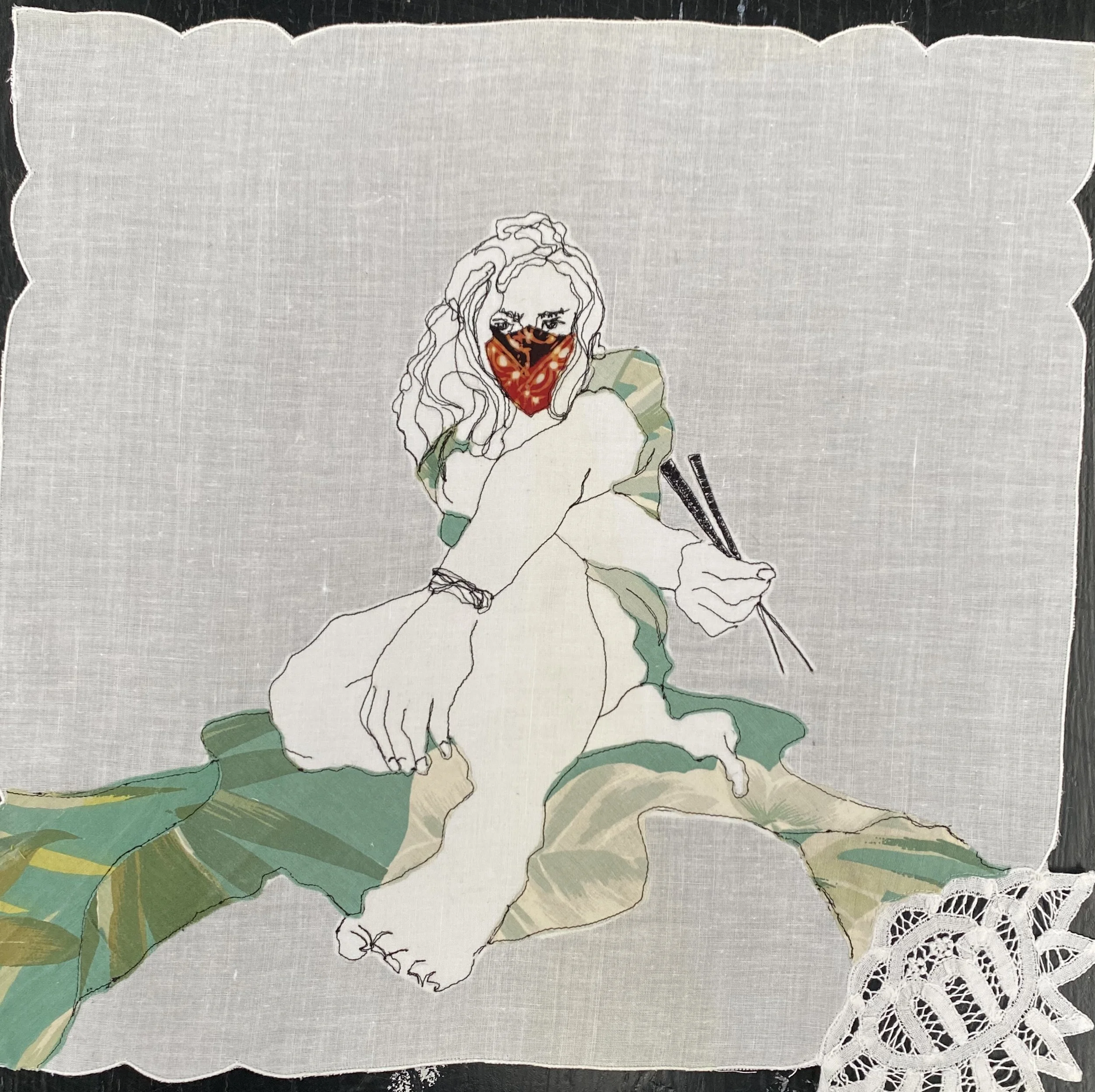 Stir Crazy (COVID-19), thread & recycled fabric on Belgian linen napkin by Juliet D Collins